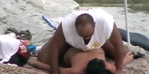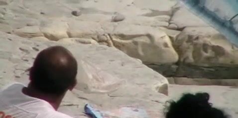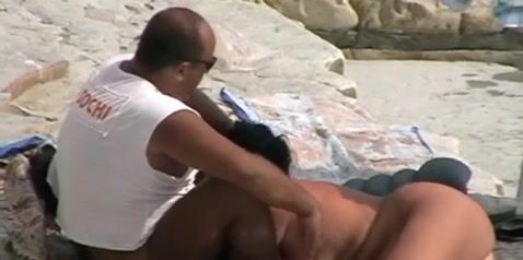 Hidden camera caught a mature amateur lady tanning naked on rocky beach, then she puts in doggy position and is fucked from behind by younger big dick stud who drills her until creampie fills her old cunt.