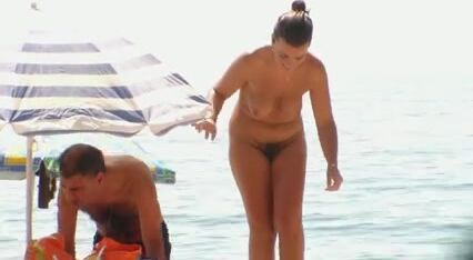 Nude beach wife exposing her hairy pussy
