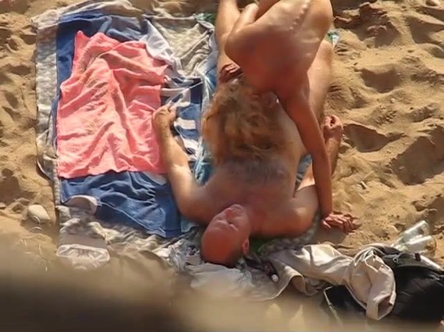 Blonde nudist woman and horny bald dude caught having sex on public beach