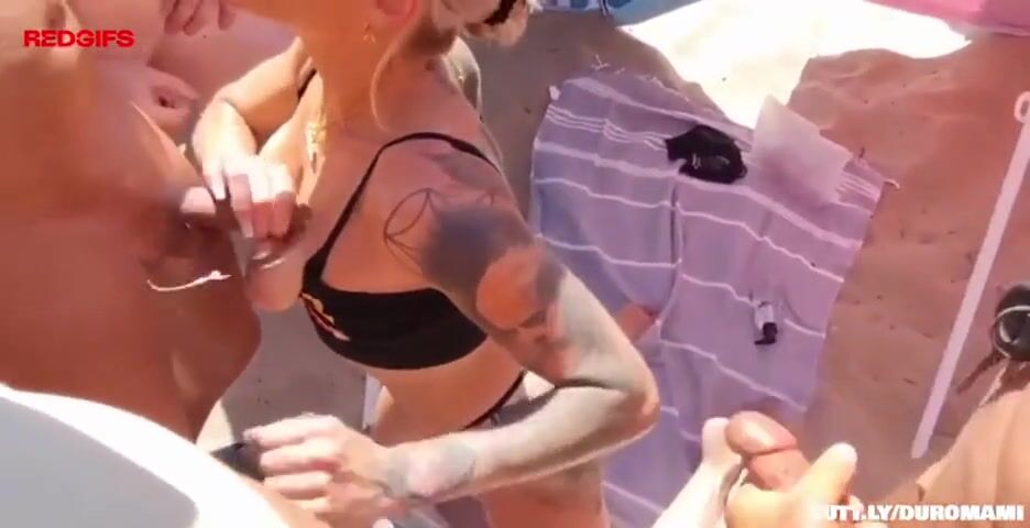 Public slut pleasures group of men on beach
