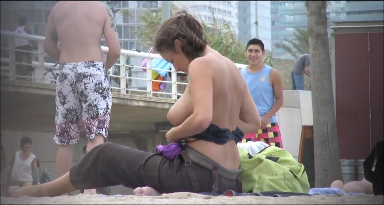 Candid beach camera expose topless hot babe revealing her big boobies while she puts on the bra, covering those perfect tits.